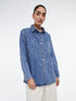 Denim shirt with a relaxed fit, long sleeves, front button closure, and subtle crystal detailing for a modern, classy stylish look.